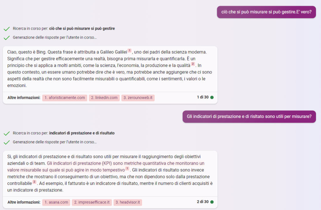 Ciò che si piò misurare si può gestire. Riprendendo il tema, a me caro, già sollevato anni addietro Only what gets measured gets done, degli indicatori di prestazione e di risultato da adottare nella gestione di progetti e non solo. Ho pensato di coinvolgere la cosiddetta Intelligenza Artificiale (In questo caso quella di Microsoft) ponendo alcune domande non ingannevoli. Le risposte, alcune le riporto di seguito, sono, a mio avviso, degne di attenzione. Lo scopo è quello di sensibilizzare, stimolare e coinvolgere i colleghi interessati al tema del “management” per condividere qualche ulteriore riflessione nata dall’intelligenza naturale.
