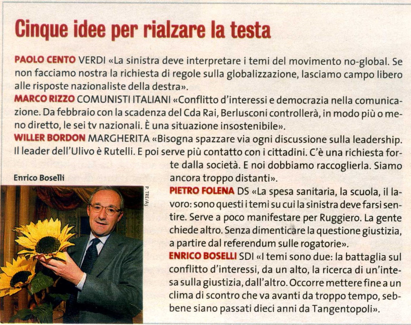 Sfogliando le pagine interne, sono stato attratto da un altro titolo, di attualità politica. “Il manuale dell’oppositore”. Scorrendo il testo mi sono reso conto che i corsi e ricorsi storici permangono, “mutatis mutandis” anche nell’era del cambiamento esponenziale. Riporto, senza ulteriori commenti, soprattutto per coloro che nel 2002 erano poco più che adolescenti, alcuni stralci che mi hanno fatto riflettere ed anche sorridere, considerando l’attualità dei temi evocati venti anni fa.