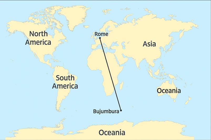 Eccola pronta! Una cartina che collega Bujumbura (Burundi) e Roma (Italia) con una linea diretta tra le due capitali: